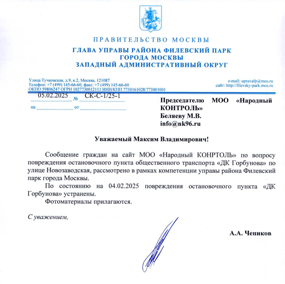 Ответ сообщил, что по состоянию на 4 февраля 2025 года управа района Филевский парк провела необходимые работы, и повреждения остановочного пункта были устранены. В подтверждение этому предоставлены фотоматериалы.