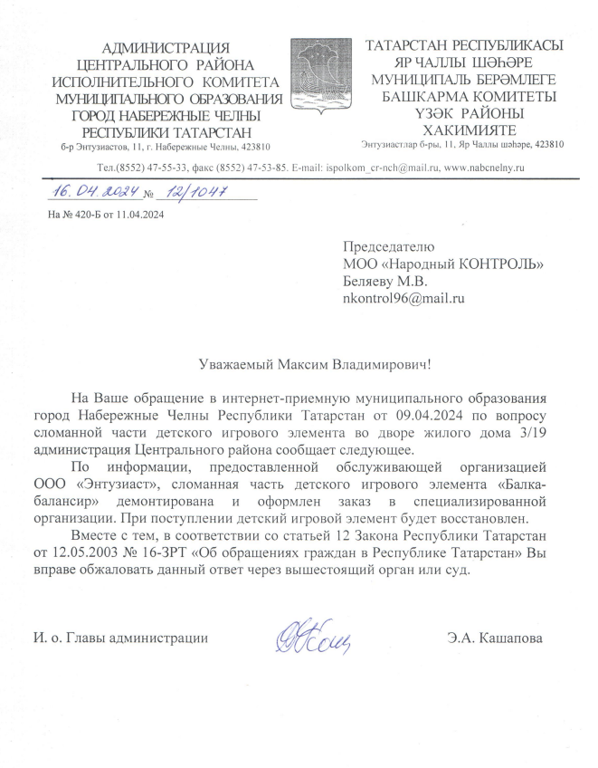 На Ваше обращение в интернет-приемную муниципального образования город Набережные Челны Республики Татарстан от 09.04.2024 по вопросу сломанной части детского игрового элемента во дворе жилого дома 3/19 администрация Центрального района сообщает следующее.