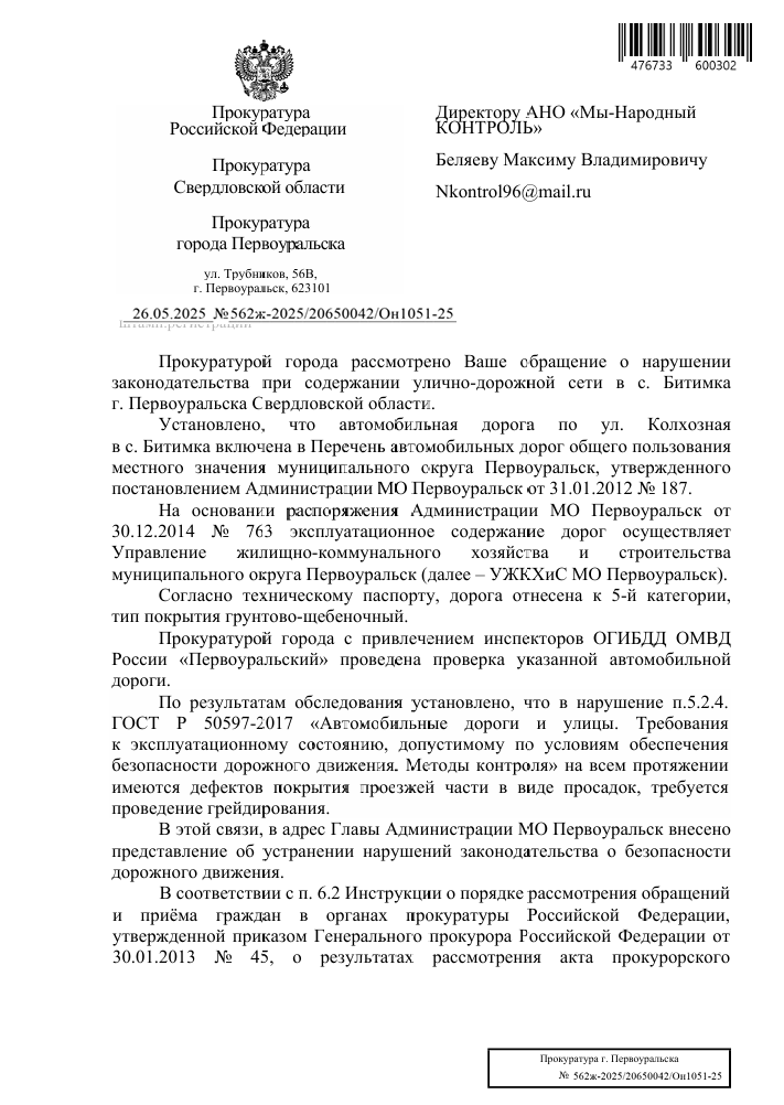 Установлено, что дорога относится к пятой категории и имеет грунтово-щебеночное покрытие. В ходе обследования зафиксированы многочисленные дефекты дорожного покрытия. В соответствии с ГОСТом, на всей протяженности дороги требуется проведение грейдирования. В адрес главы администрации Первоуральска внесено представление с требованием устранить нарушения. Дополнительная информация о результатах рассмотрения будет направлена заявителям в установленный срок.