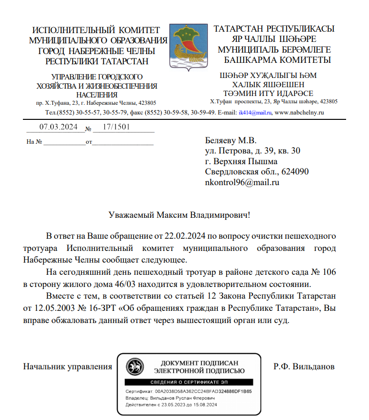 Публикуем ранее поступивший ответ по обращению жителей города Набережные Челны республики Татарстан