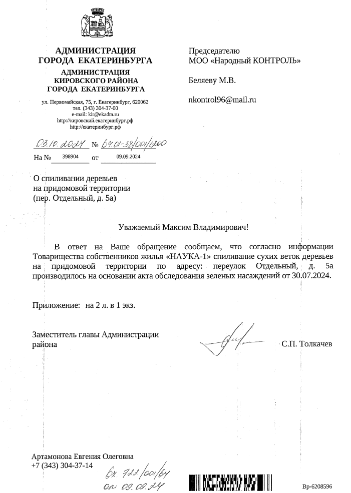 На обращение был получен ответ Администрации Кировского района Екатеринбурга.