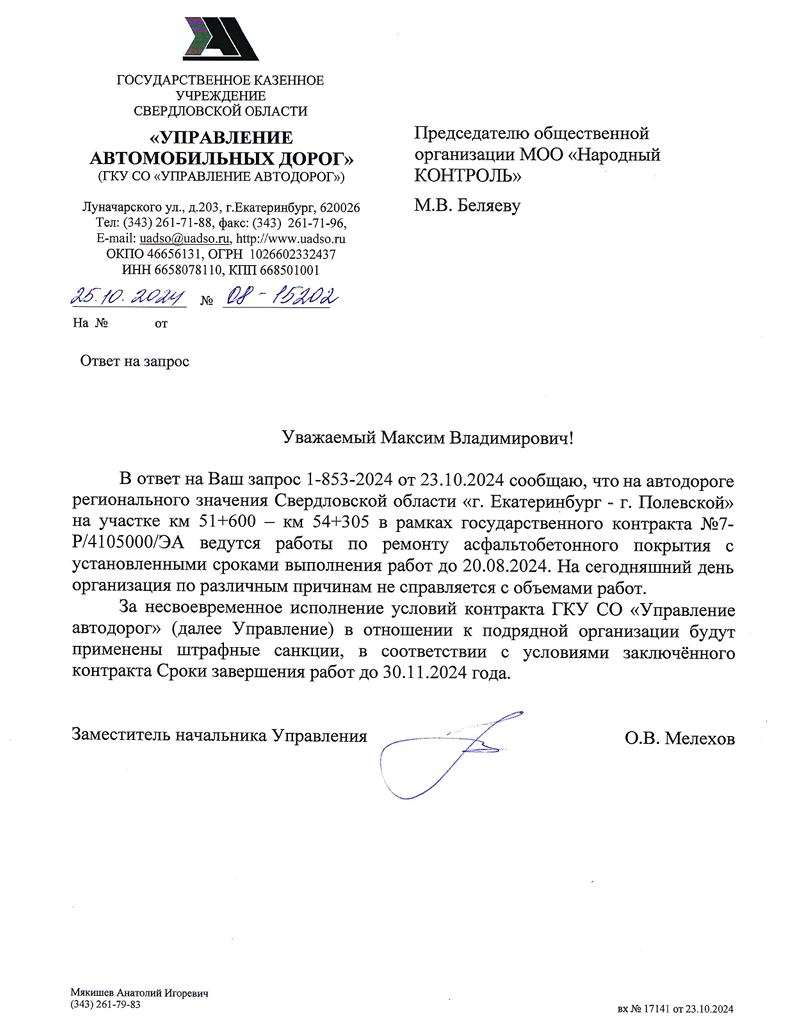 Как следует из ответа, ремонт асфальтобетонного покрытия на участке автодороги регионального значения, соединяющей Екатеринбург и Полевской, должен был завершиться к августу 2024 года. Однако подрядчик, отвечающий за выполнение работ, не справился с их объемом, из-за чего сроки завершения ремонта были продлены до 30 ноября 2024 года. Управление автомобильных дорог Свердловской области планирует применить штрафные санкции к подрядной организации за нарушение условий контракта и несвоевременное выполнение работ.