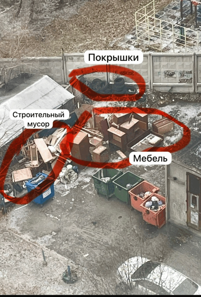 На приложенном фото видно значительное скопление строительного мусора, старой мебели и покрышек вокруг контейнеров для бытовых отходов. Такая ситуация вызывает обеспокоенность у местных жителей, так как несанкционированная свалка может стать источником инфекций, привлечь грызунов и создать неприятные запахи.