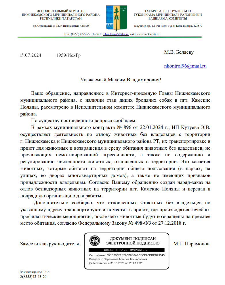 Публикуем ранее поступивший ответ по обращению пгт Камские Поляны республики Татарстан по вопросу отлова собак.