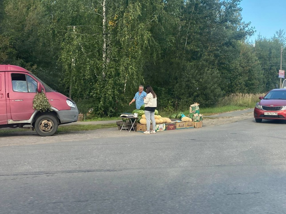 Стихийная незаконная продажа овощей и фруктов лицами с иностранным гражданством ведётся на перекрестке улиц Шабердинский тракт и Вараксинский бульвар, г. Ижевск. Продавец припарковал свою газель и продает фрукты, овощи и бахчевые, а также банные веники прямо на перекрестке.