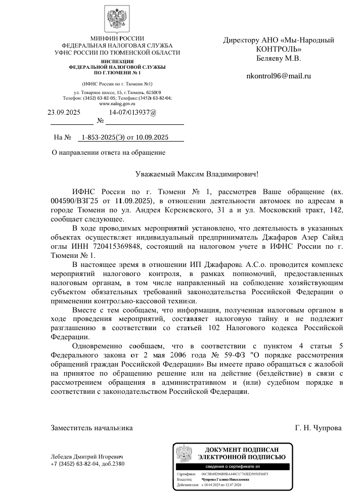 Налоговые органы подтвердили начало проверки в отношении установленного владельца автомоек ИП Джафарова А. С. В рамках налогового контроля проводится проверка соблюдения требований о применении ККТ. При этом подробности проверки не разглашаются со ссылкой на положения о налоговой тайне.