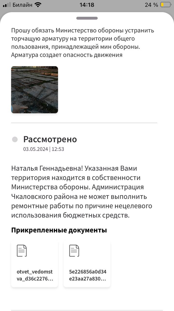 5 июня 2024 год. Город Екатеринбург. Помогите убрать торчащую арматуру на тротуаре по ул. Щербакова, напротив артиллерийского училища. Администрация считает, что на метр правее они не вправе её спиливать 🙈 (рядом с КПП Щербакова 137). Жители просят помочь провести проверку и принять строгие меры.