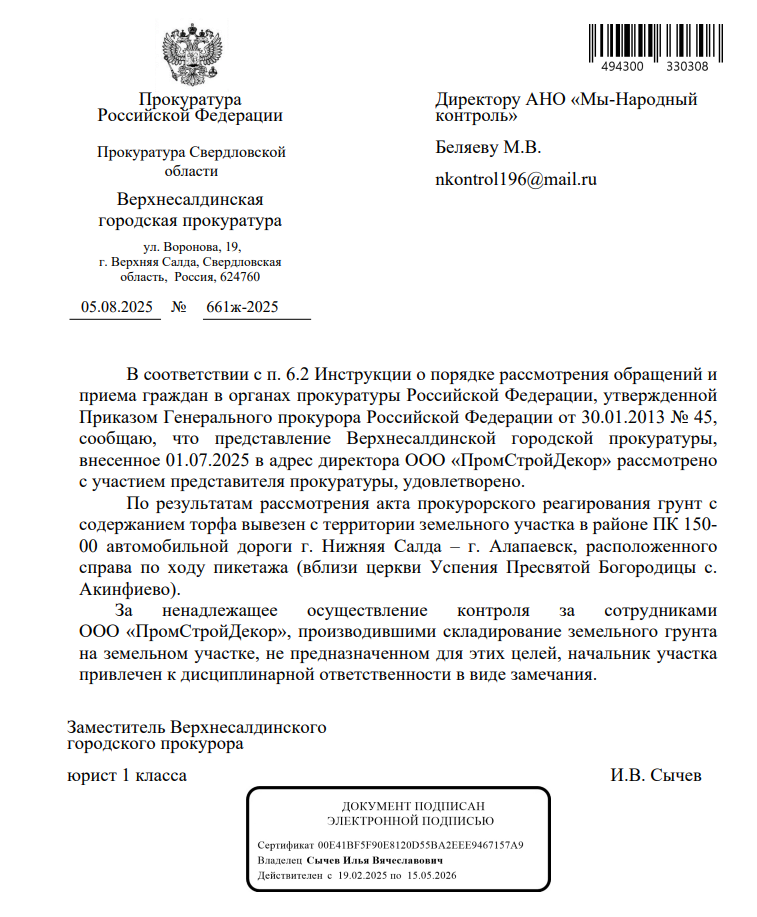 В августе прокуратура сообщила о результатах реагирования. Представление, внесённое 1 июля, было рассмотрено с участием представителя надзорного органа и удовлетворено. Торфяной грунт вывезли с территории возле церкви, а начальник участка ООО «ПромСтройДекор» получил дисциплинарное взыскание в виде замечания за ненадлежащий контроль над сотрудниками.