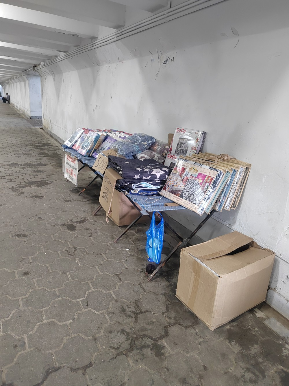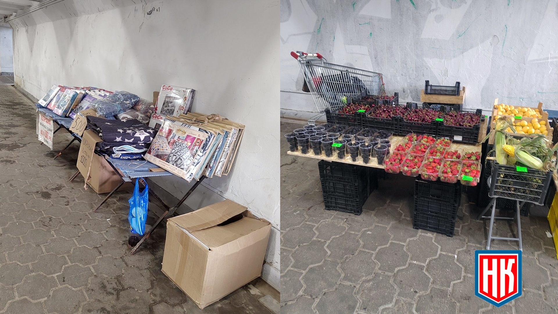 6 июня 2024 г. Екатеринбург, незаконная торговля фруктами в подземном переходе на ул. Халтурина ост. Карнавал приросла постельным бельём