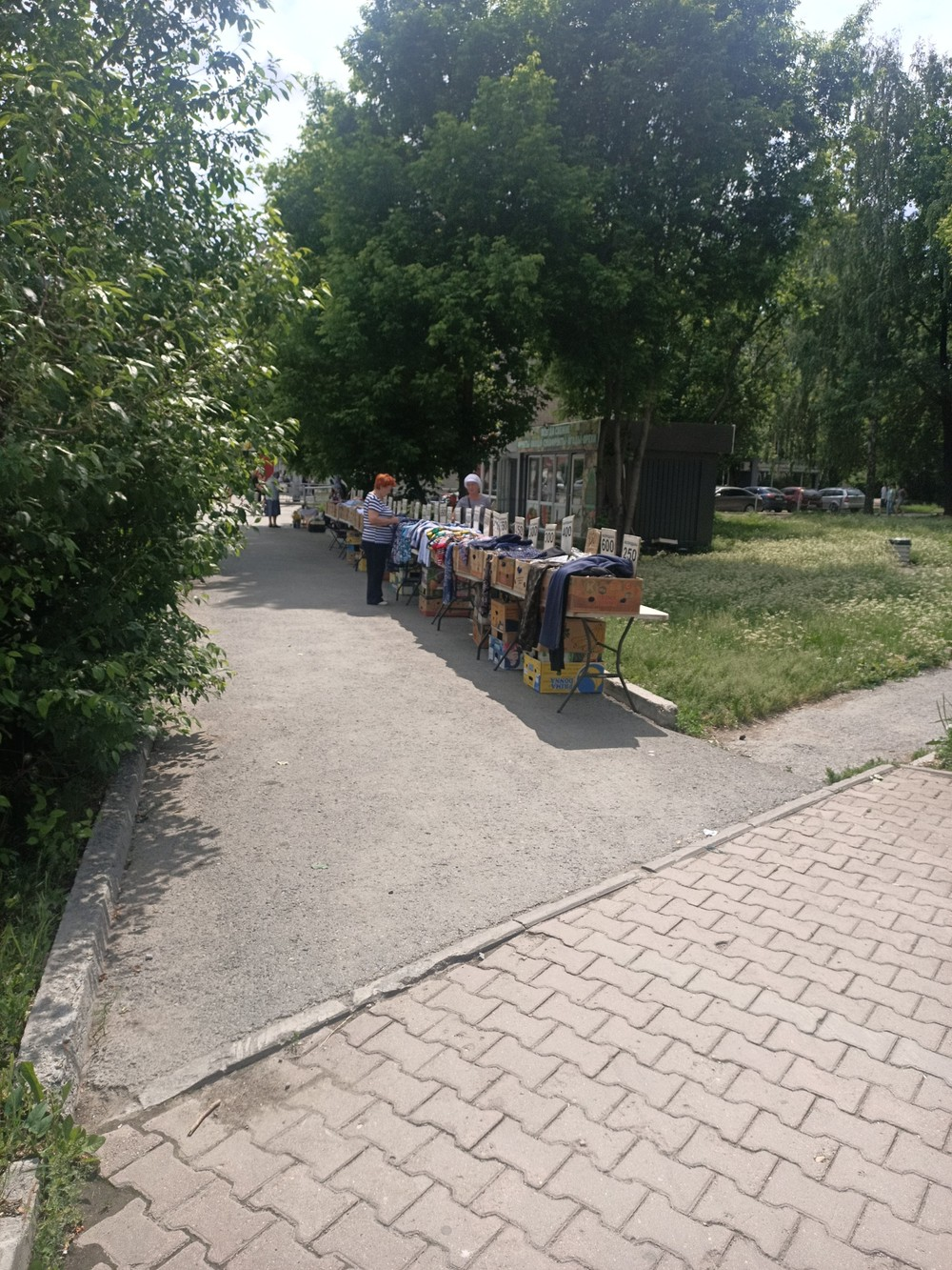 22.06.24 г., 12:40. г. Екатеринбург, ул. Щербакова 5/4. Перекресток с Павлодарской, торговля на тротуаре бельем.