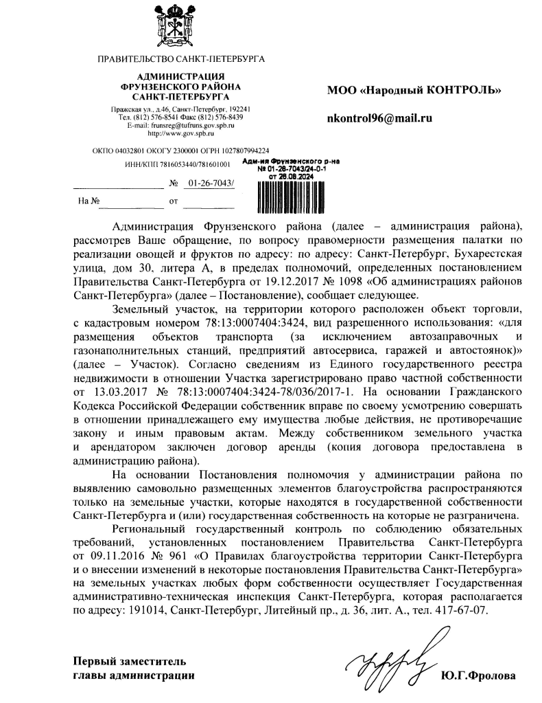 Ответ Администрации Фрунзенского района Санкт-Петербурга: