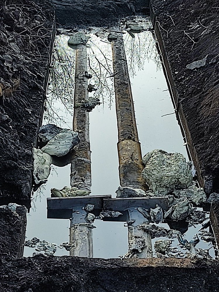 Недавно завершены работы по сварке труб, однако, по мнению местных жителей, качество сварки оставляет желать лучшего: на швах образуются свищи, а вода наполняет траншею, что способствует дальнейшему провалу грунта.