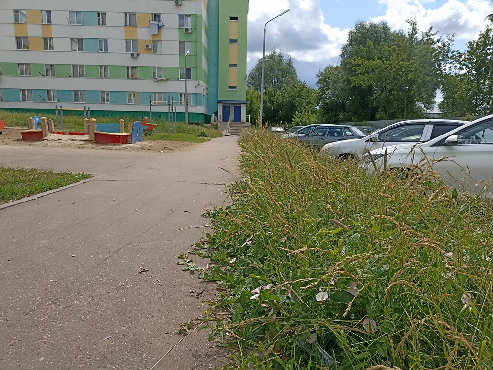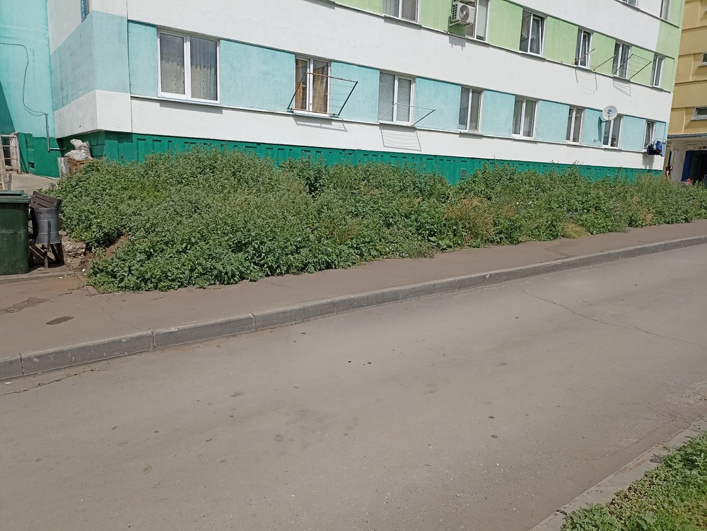 Неделю назад подавал заявку в ЖЭК по адресу: г. Набережные Челны, Казанский проспект, д. 32, Республика Татарстан, чтобы скосили траву во дворе дома. 23.06.2025 г., с утра мне позвонили из ЖЭКа и сообщили, что трава скошена. Однако на самом деле трава не скошена — фотографии сделаны сегодня после звонка из ЖЭКа.