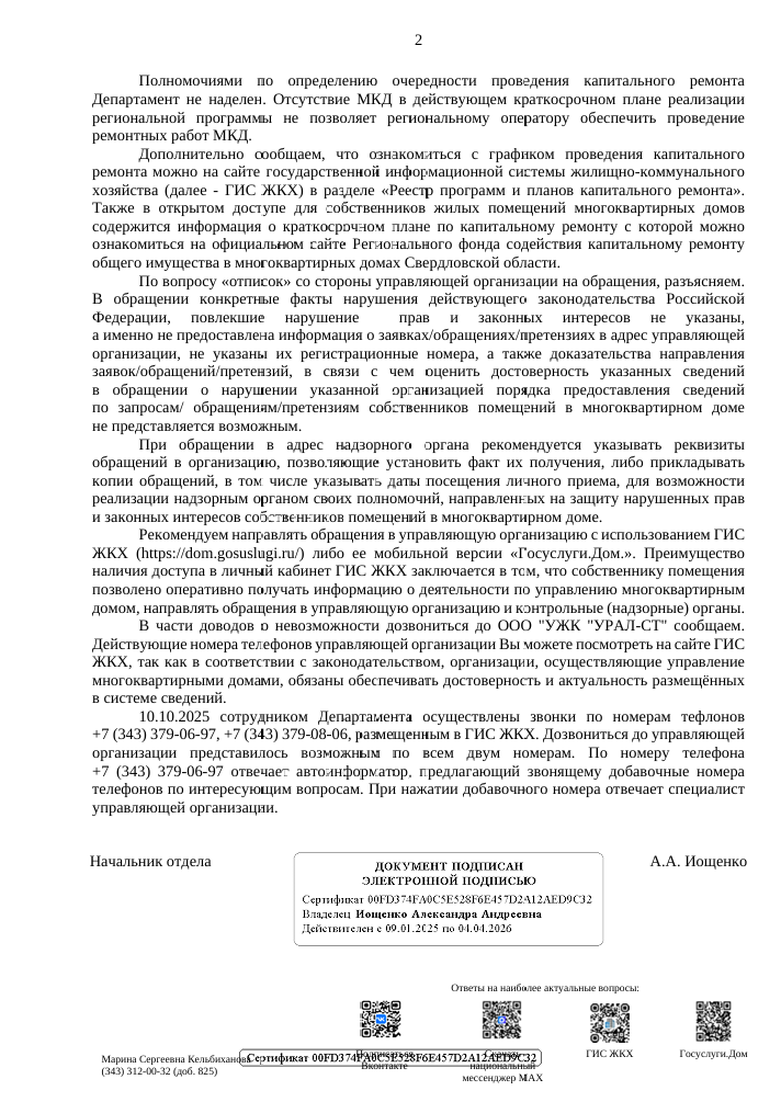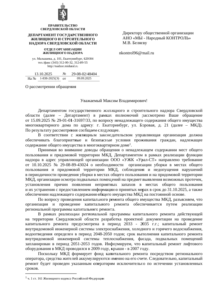 На обращение был получен ответ от Департамента жилищного надзора Свердловской области.