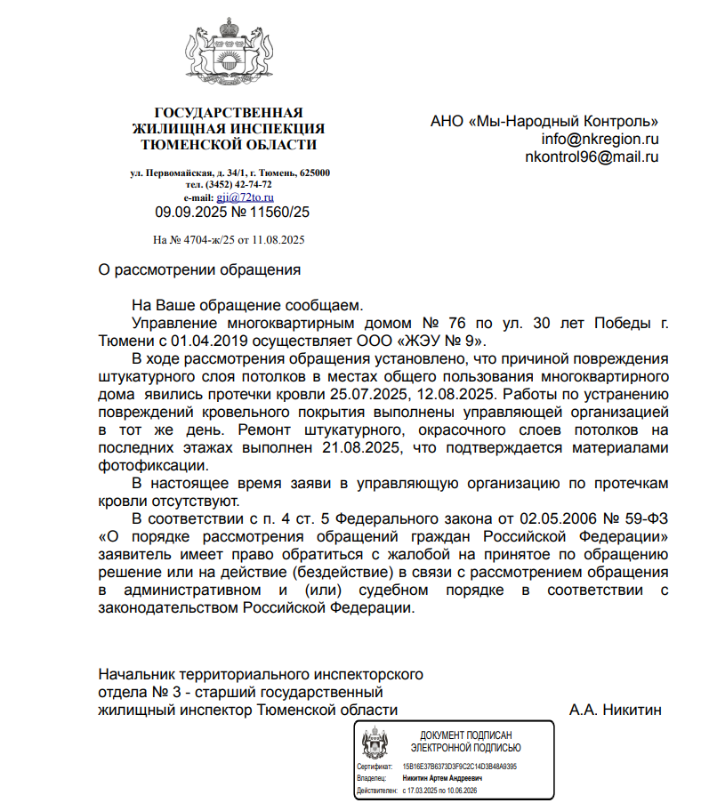 Благодарим неравнодушных граждан за Ваши обращения. Если Вы не согласны с данным ответом Госжилинспекции Тюменской области, пожалуйста, сообщите об этом Нам (желательно с фото/видео доказательствами выполнения работы в неполном объеме или ее невыполнении).
