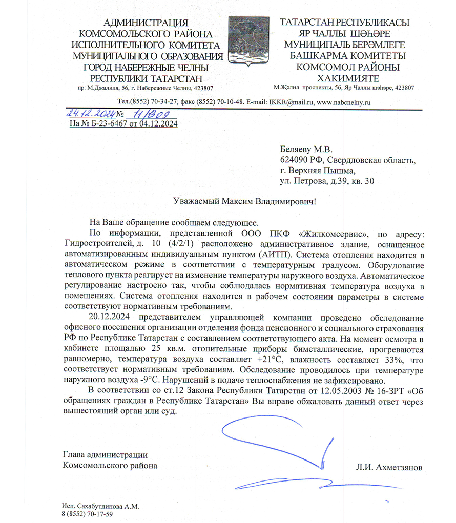 20 декабря представители УК провели обследование кабинета на втором этаже здания, принадлежащего отделению фонда пенсионного и социального страхования РФ по Республике Татарстан. Согласно акту осмотра, отопительные приборы в кабинете площадью 25 кв.м. прогревались равномерно. Температура воздуха составила +21°С, влажность — 33%, что соответствует нормативным требованиям. На момент обследования температура наружного воздуха составляла -9°С. Нарушений в работе системы теплоснабжения зафиксировано не было.