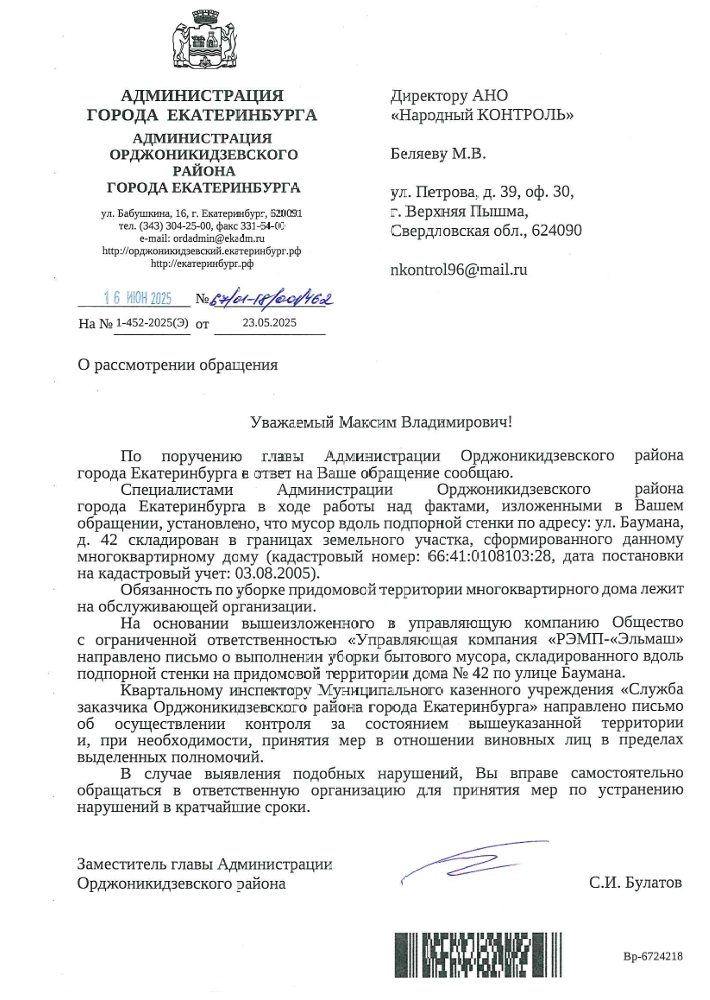 В связи с этим в адрес ООО «УК «РЭМП-Эльмаш» направлено письмо с требованием провести уборку бытового мусора вдоль подпорной стенки. Также квартальному инспектору МКУ «Служба заказчика Орджоникидзевского района» поручено контролировать состояние участка и при необходимости принимать меры в отношении ответственных лиц в пределах своих полномочий.