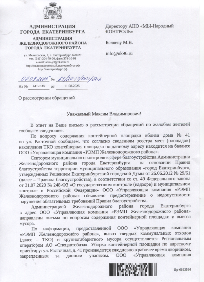 На эти обращения был получен ответ от администрации Железнодорожного района.