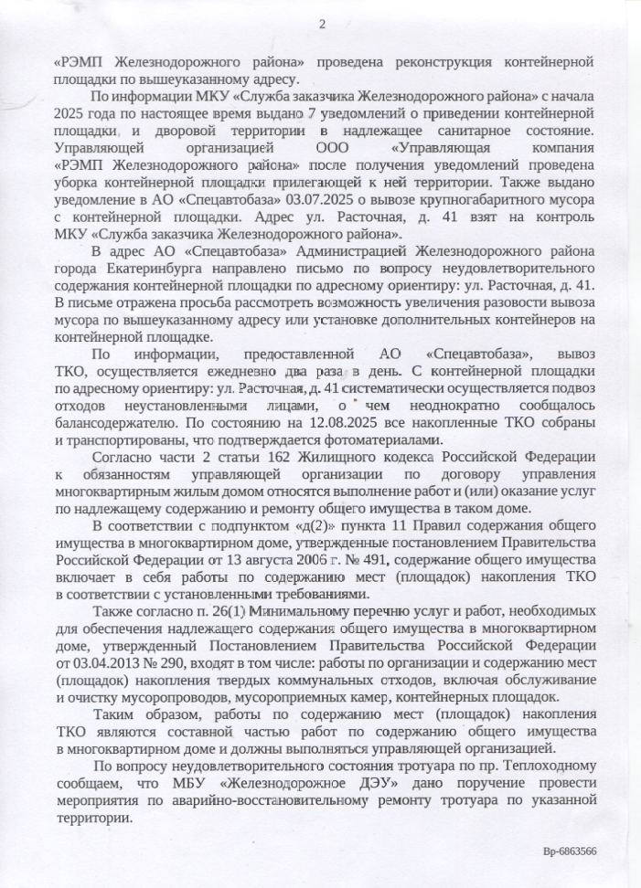По вопросу мусорной площадки на Расточной установлено, что она находится на балансе управляющей компании «РЭМП». УК было объявлено официальное предостережение о недопустимости нарушений, а регоператору «Спецавтобаза» направлено требование рассмотреть возможность увеличения частоты вывоза мусора. Сообщается, что площадка была реконструирована, а ее уборка проводится ежедневно.