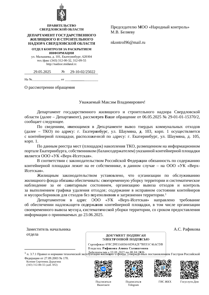 В ответ на обращение Департамент государственного жилищного и строительного надзора Свердловской области сообщил, что вывоз ТКО с данного адреса осуществляется с контейнерной площадки у дома 105к1, которая принадлежит ООО «УК «Верх-Исетская»».