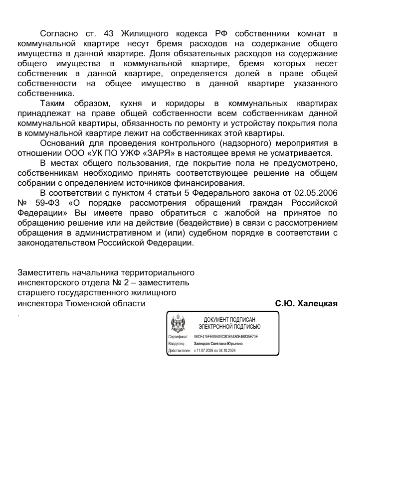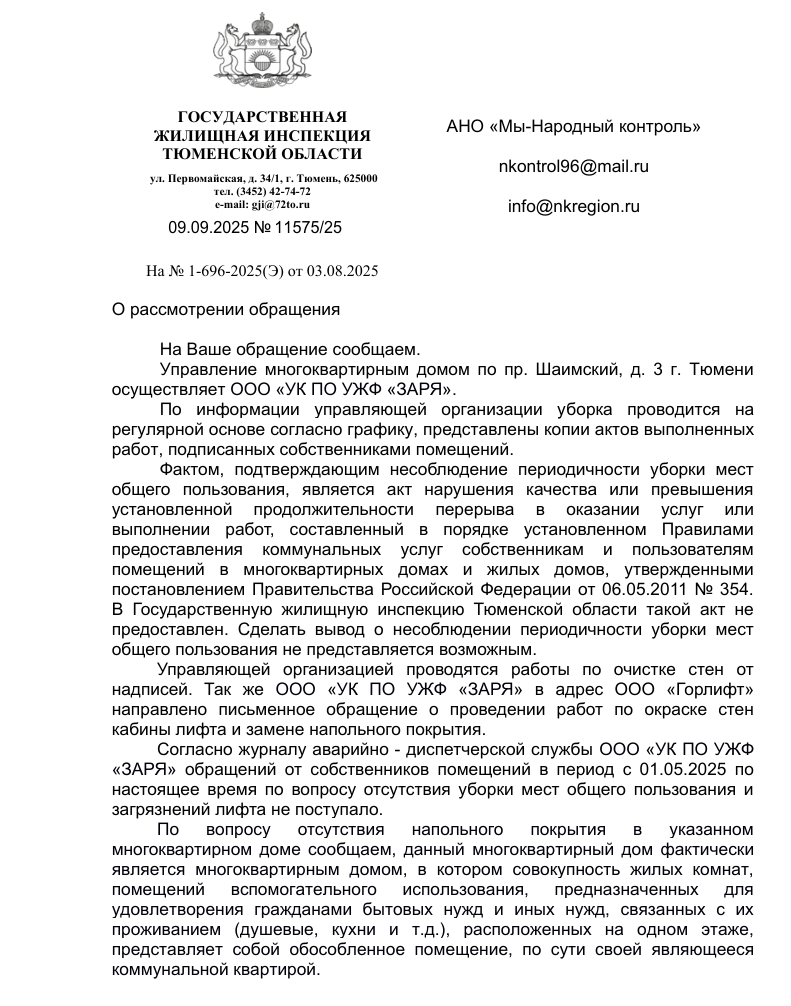 В новом ответе Государственная жилищная инспекция сообщила, что дом юридически является коммунальной квартирой, где обязанность по ремонту общего имущества (включая полы) лежит на собственниках. УК предоставила акты уборки, утверждая, что жалоб от жителей не поступало, а работы по очистке стен и ремонту лифта уже «планируются». Инспекция не усмотрела оснований для проверки УК и рекомендовала жителям самостоятельно решать вопросы ремонта на общем собрании.