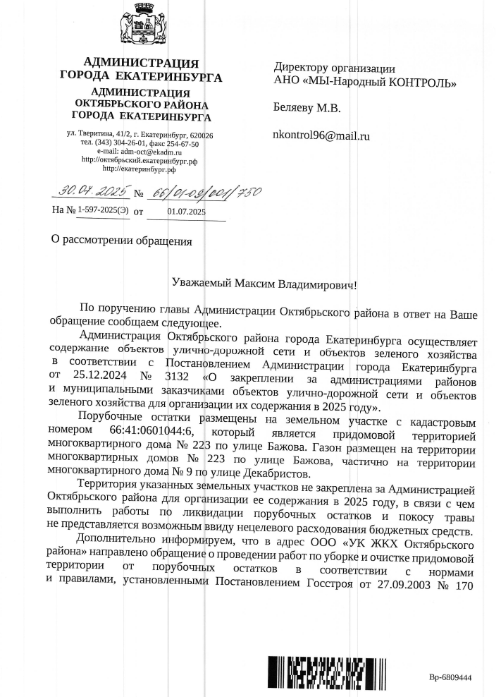 В ответ администрация Октябрьского района пояснила, что территория с остатками от порубки относится к придомовой зоне дома № 223 по ул. Бажова и частично к дому № 9 по ул. Декабристов. Поскольку участок не закреплён за районной администрацией на 2025 год, выполнение работ за счёт бюджета считается нецелевым использованием средств.