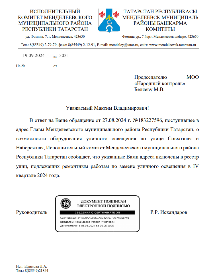 На это обращение был получен ответ из Исполнительного комитета Менделеевского муниципального района.