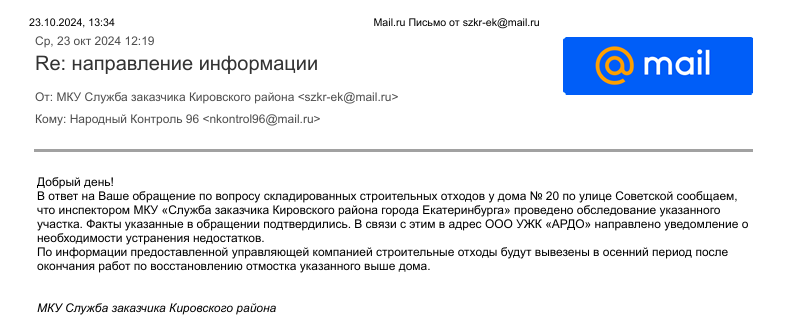 Согласно ответу, после обращения инспектор МКУ «Служба заказчика Кировского района города Екатеринбурга» провел обследование участка. Факты, указанные в жалобе, подтвердились. В связи с этим в адрес управляющей компании было направлено уведомление с требованием устранить нарушения и вывести строительные отходы.