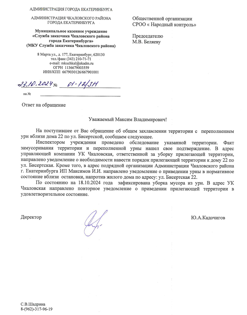 В ответе сообщается, что инспектор учреждения провел обследование территории и подтвердил факт захламления, включая переполненные урны. На управляющую компанию УК Чкаловская, ответственной за уборку прилегающей территории, было направлено уведомление с требованием навести порядок.