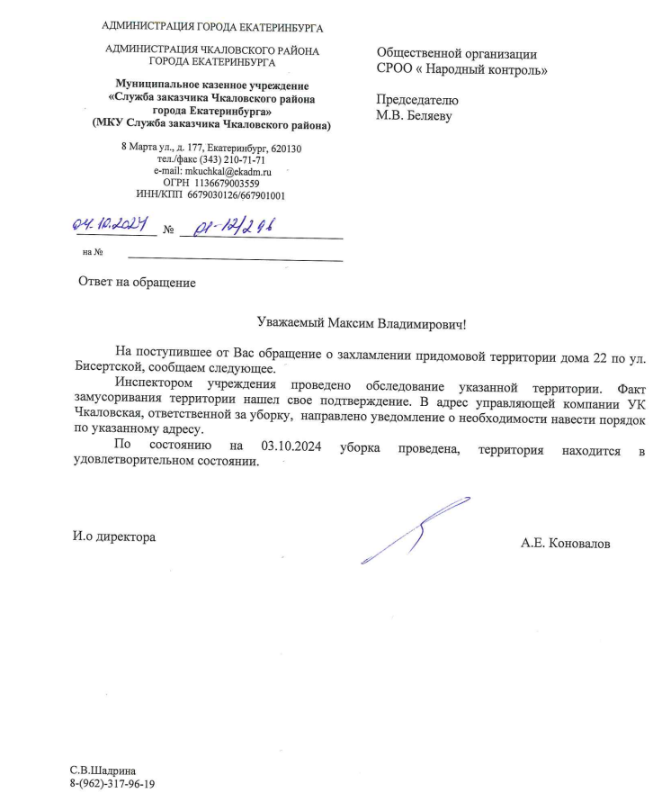 На обращение, полученное 16 сентября из города Екатеринбурга по вопросу захламления придомовой территории на улице Бисертской был получен ответ от МКУ «Служба заказчика Чкаловского района».