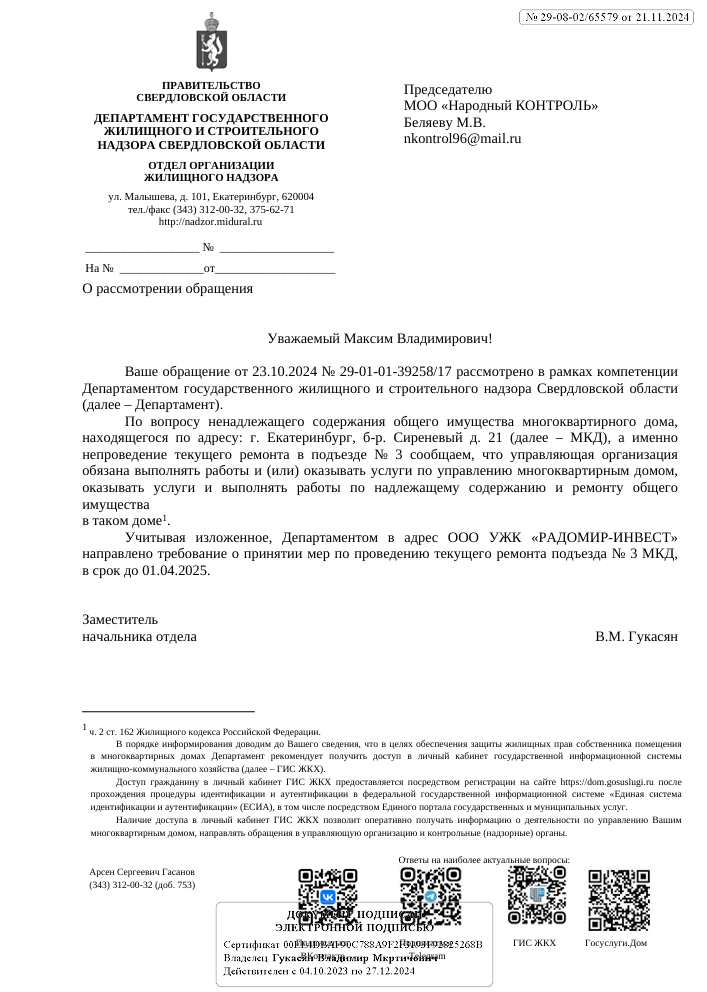 В ответе департамента, датированном 23 октября 2024 года, указано, что управляющая компания обязана обеспечивать надлежащее содержание и ремонт общего имущества многоквартирного дома.