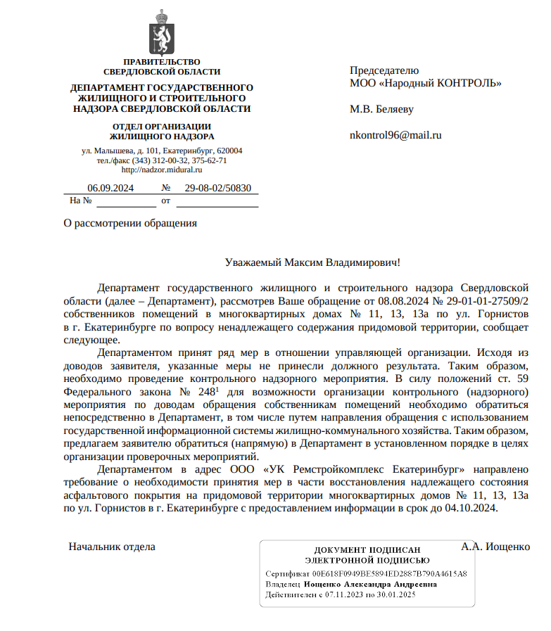 Департамент государственного жилищного и строительного надзора Свердловской области (далее – Департамент), рассмотрев Ваше обращение от 08.08.2024 № 29-01-01-27509/2 собственников помещений в многоквартирных домах № 11, 13, 13а по ул. Горнистов в г. Екатеринбурге по вопросу ненадлежащего содержания придомовой территории, сообщает следующее