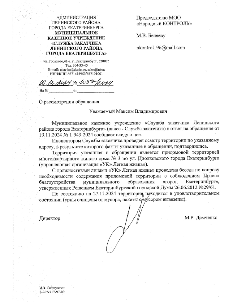 На это обращение отреагировало МКУ «Служба заказчика Ленинского района города Екатеринбурга».
