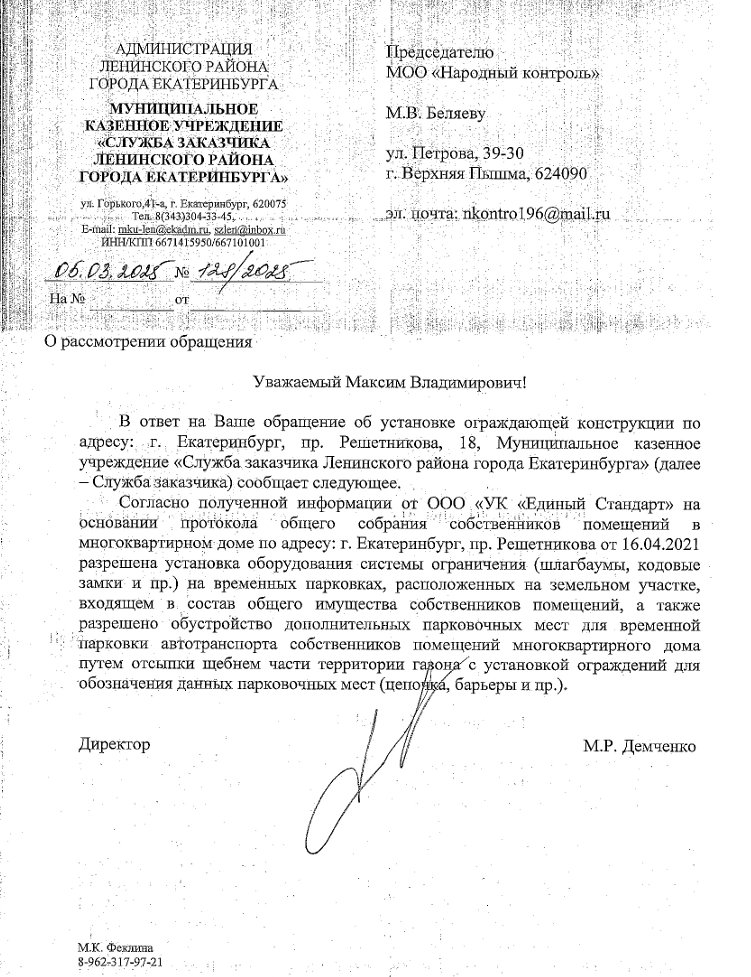 В ответ на обращение Муниципальное казенное учреждение «Служба заказчика Ленинского района города Екатеринбурга» сообщило, что установка ограждений на этом участке была разрешена на основании протокола общего собрания собственников помещений многоквартирного дома, состоявшегося 16 апреля 2021 года.