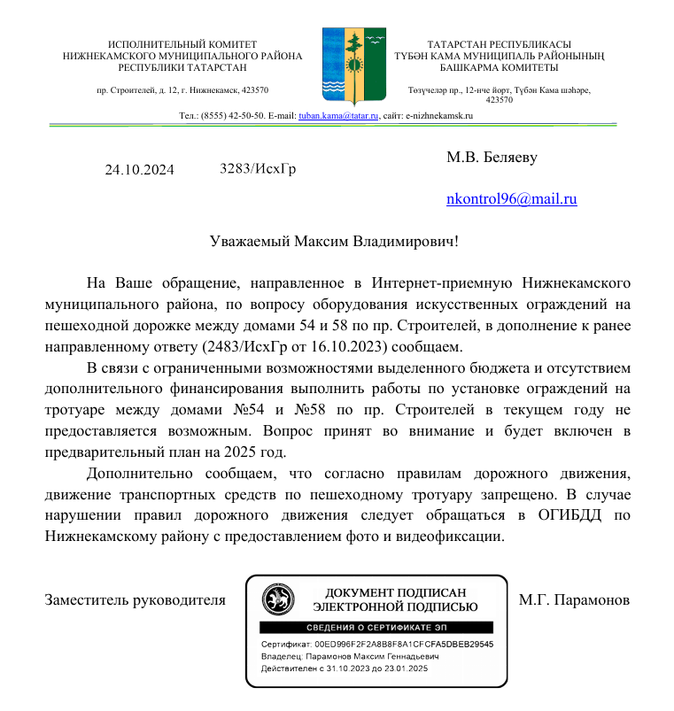На обращение спустя год был получен ответ от Исполнительного комитета Нижнекамского муниципального района.