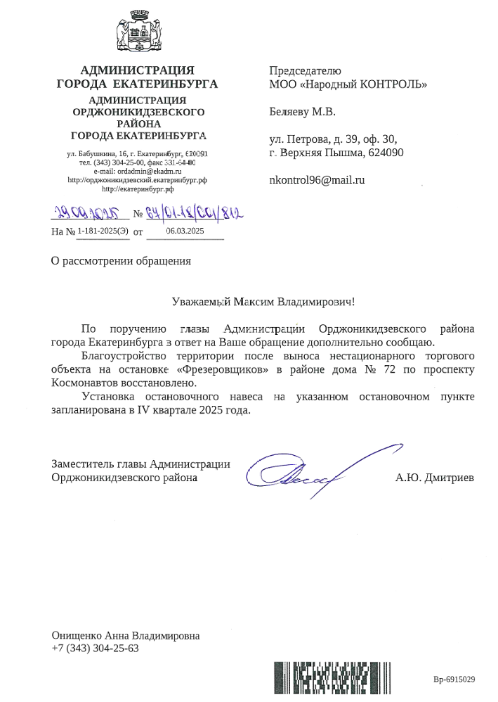 Первые ответы администрации района, поступившие в марте 2025 года, содержали одинаковую информацию: установка остановочных павильонов на обеих остановках была запланирована на III квартал 2025 года.