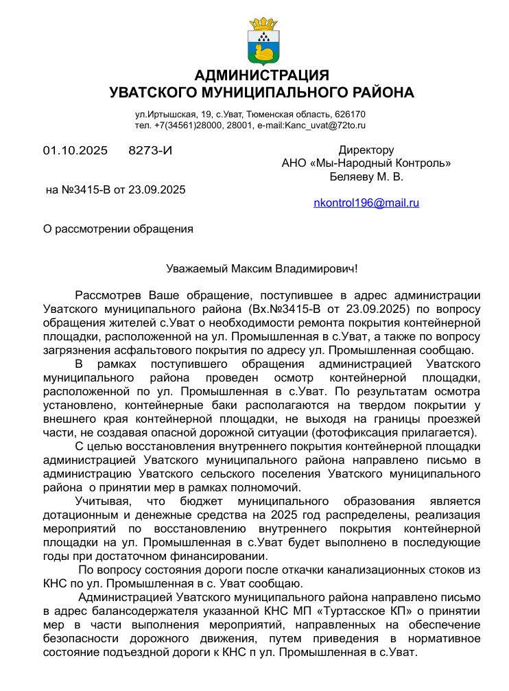 Рассмотрев обращения, администрация Уватского муниципального района провела проверку контейнерной площадки. В ответе утверждается, что баки располагаются «у внешнего края площадки» и «не создают опасной дорожной ситуации». При этом администрация признала, что внутреннее покрытие действительно требует восстановления, но объявила, что ремонт откладывается на неопределенный срок из-за отсутствия денег в бюджете.