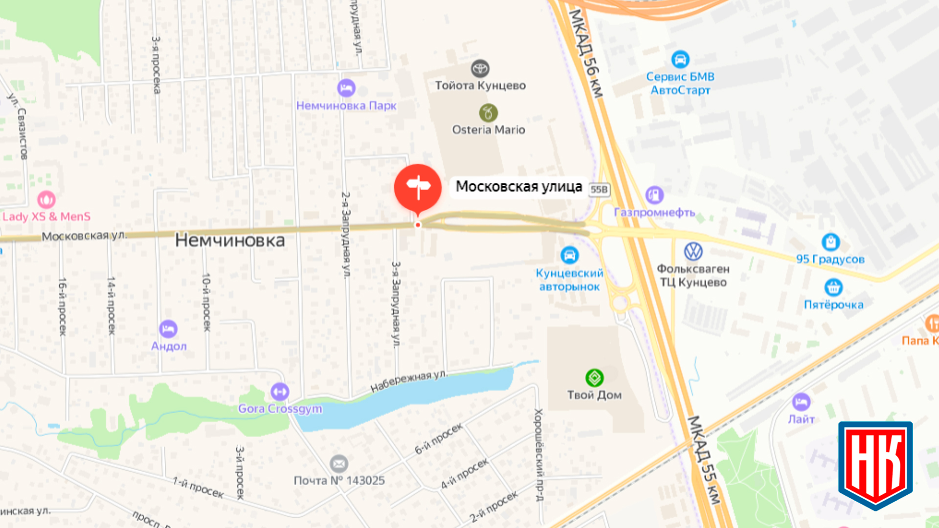 55.723630, 37.372206 выезд из села Немчиновка (у нас одна дорога на выезд двух сел через Техцентр Кунцево) , ямы на пол колеса, остановиться сфотографировать нет возможности. Указанная автомобильная дорога находится в частной собственности ЗАО ПКП «Кунцево».( дорога местного масштаба! Выезд двух сел) в частных руках! Администрация города Одинцово рычагов, с их слов не имеет или не хочет разбираться.
