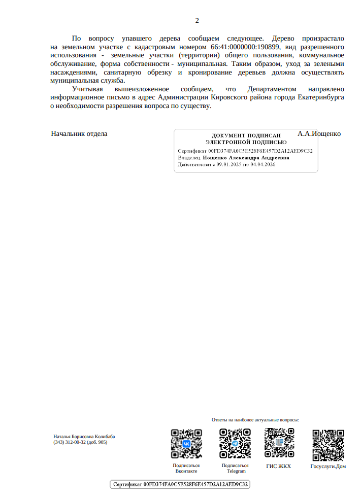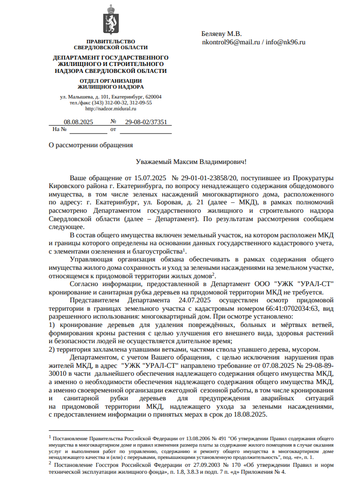 В адрес управляющей компании «УЖК УРАЛ-СТ» направлено требование устранить выявленные недостатки и обеспечить регулярный уход за придомовой территорией. Вопрос упавшего дерева, находящегося на муниципальной земле, передан в администрацию Кировского района для дальнейшего решения.