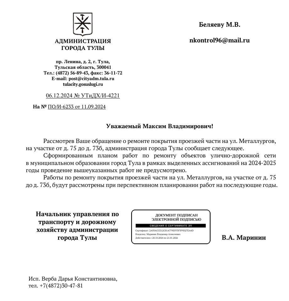 На обращение горожан администрация Тулы ответила, что ремонт дороги на указанном участке не предусмотрен в рамках выделенных ассигнований на 2024–2025 годы. Однако вопрос о проведении работ по восстановлению дорожного покрытия будет рассмотрен при перспективном планировании на последующие годы.
