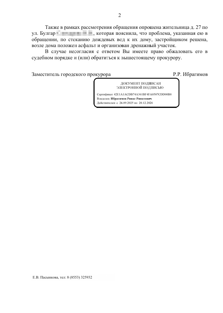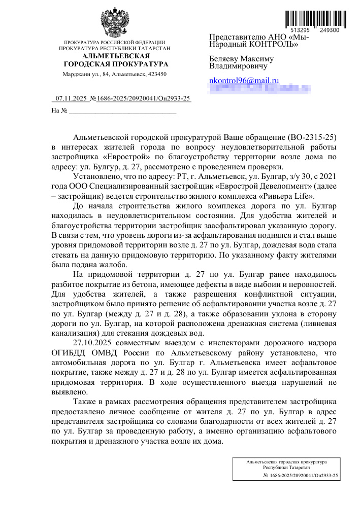 В ходе проверки установлено, что дорога по улице Булгар была приведена в порядок застройщиком «Еврострой», а придомовая территория возле дома 27 была асфальтирована и оборудована дренажной системой для отвода дождевых вод. Нарушений не выявлено, а жители дома выразили благодарность за проведённые работы.