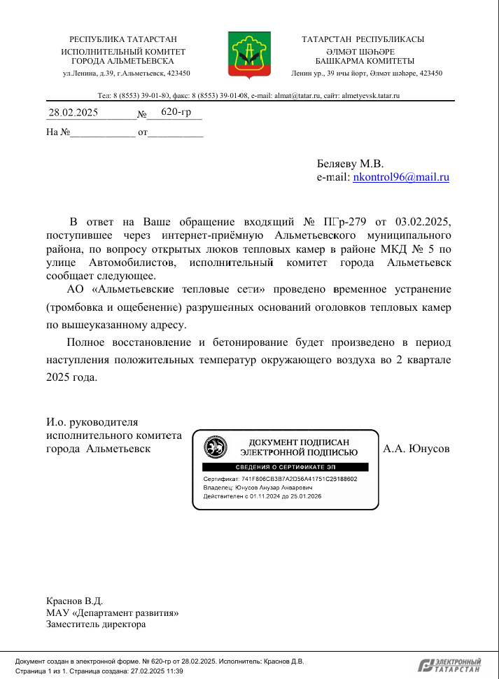 В ответе сообщили, что АО «Альметьевские тепловые сети» провели временное устранение проблемы с разрушенными основаниями тепловых камер. Работы были выполнены в виде тромбовки и ощебенения. Полное восстановление и бетонирование люков будет проведено в период наступления положительных температур в 2 квартале 2025 года.