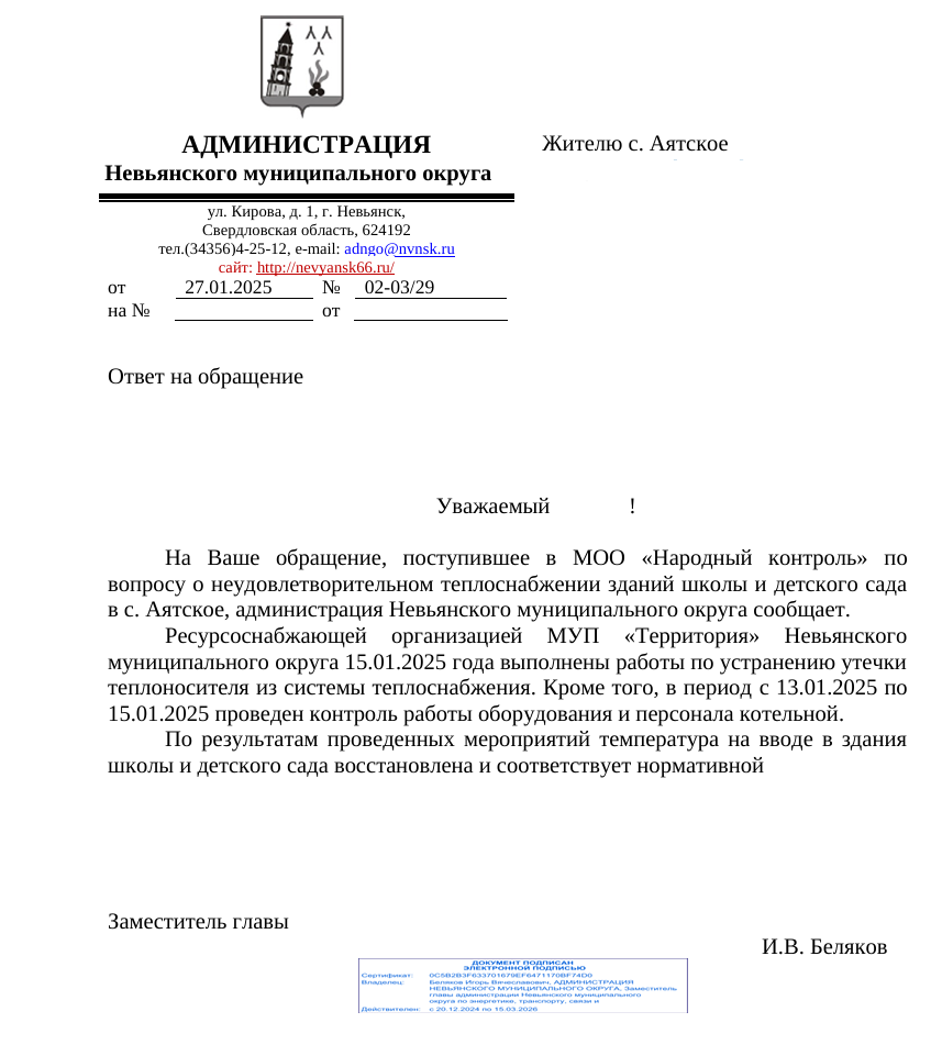Из села Аятское Невьянского муниципального округа 13 января поступило обращение о том, что температура в здании местной школы не соответствовала нормам, из-за чего дети испытывали дискомфорт.
