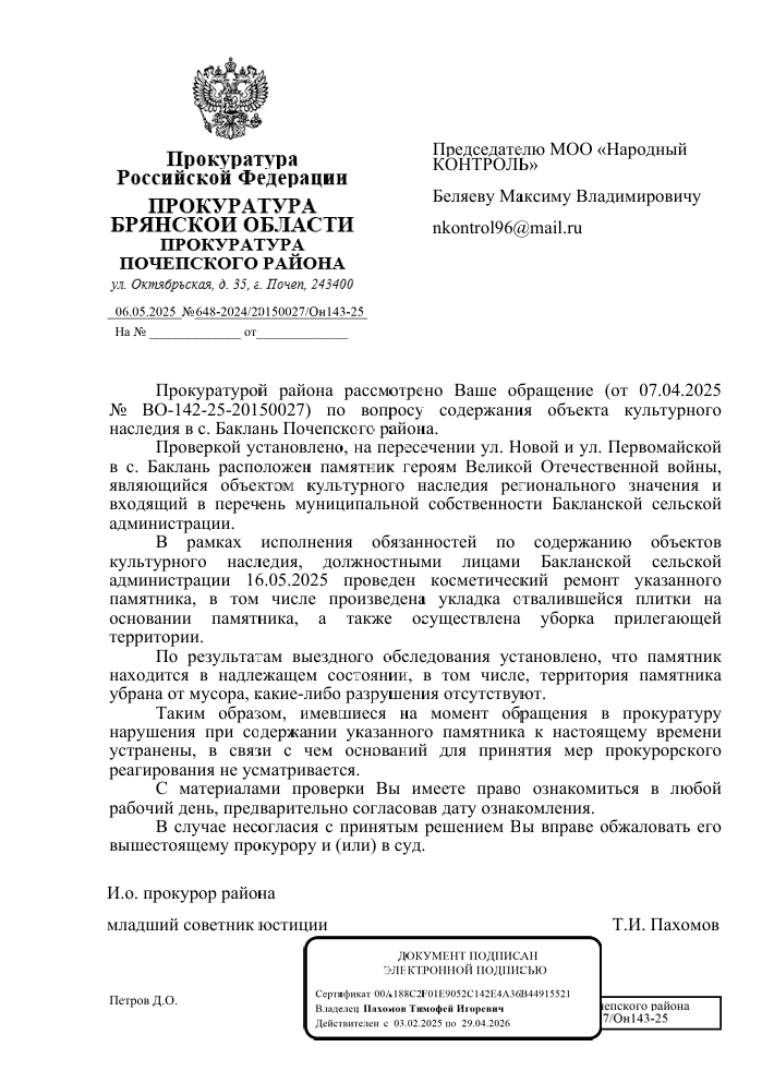 В начале апреля из села Баклань Брянской области было получено обращение о разрушении памятника Великой Отечественной войне, расположенного на пересечении улиц Новой и Первомайской. В обращении указывалось на разрушение плитки и возможное повреждение мемориальной доски. Жители района выразили обеспокоенность состоянием памятника и несоответствующим уходом со стороны местных властей.