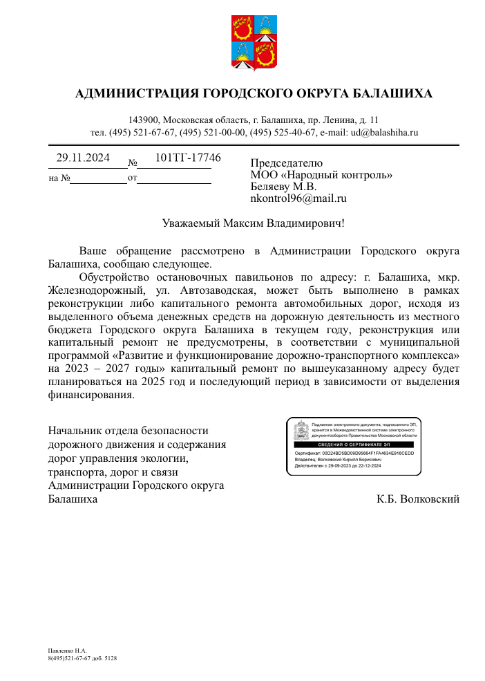 Ответ сообщил, что вопрос обустройства остановочных павильонов в данном районе планируется решить в рамках реконструкции или капитального ремонта дорог. Однако, согласно муниципальной программе «Развитие и функционирование дорожно-транспортного комплекса», в текущем году в рамках выделенных бюджетных средств на дорожную деятельность реконструкция или капитальный ремонт остановки не предусмотрены. Администрация города сообщила, что обустройство павильонов на указанном участке может быть запланировано на 2025 год или в последующие годы в зависимости от объема финансирования, выделяемого на дорожные работы.