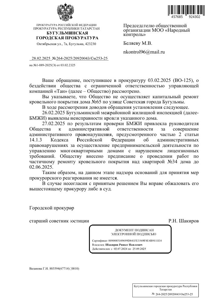 В феврале 2025 года Бугульминская межрайонная жилищная инспекция провела проверку и выявила неисправности кровли. По итогам проверки руководитель управляющей компании был привлечен к административной ответственности, а организации выдано предписание провести частичный ремонт крыши до 2 июня 2025 года.