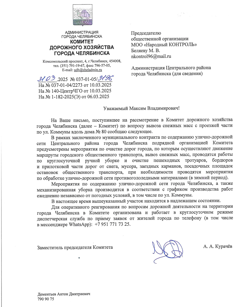 Для обращений по вопросам уборки дорог в Челябинске круглосуточно работает диспетчерская служба: +7 951 771 73 25 (в том числе WhatsApp).