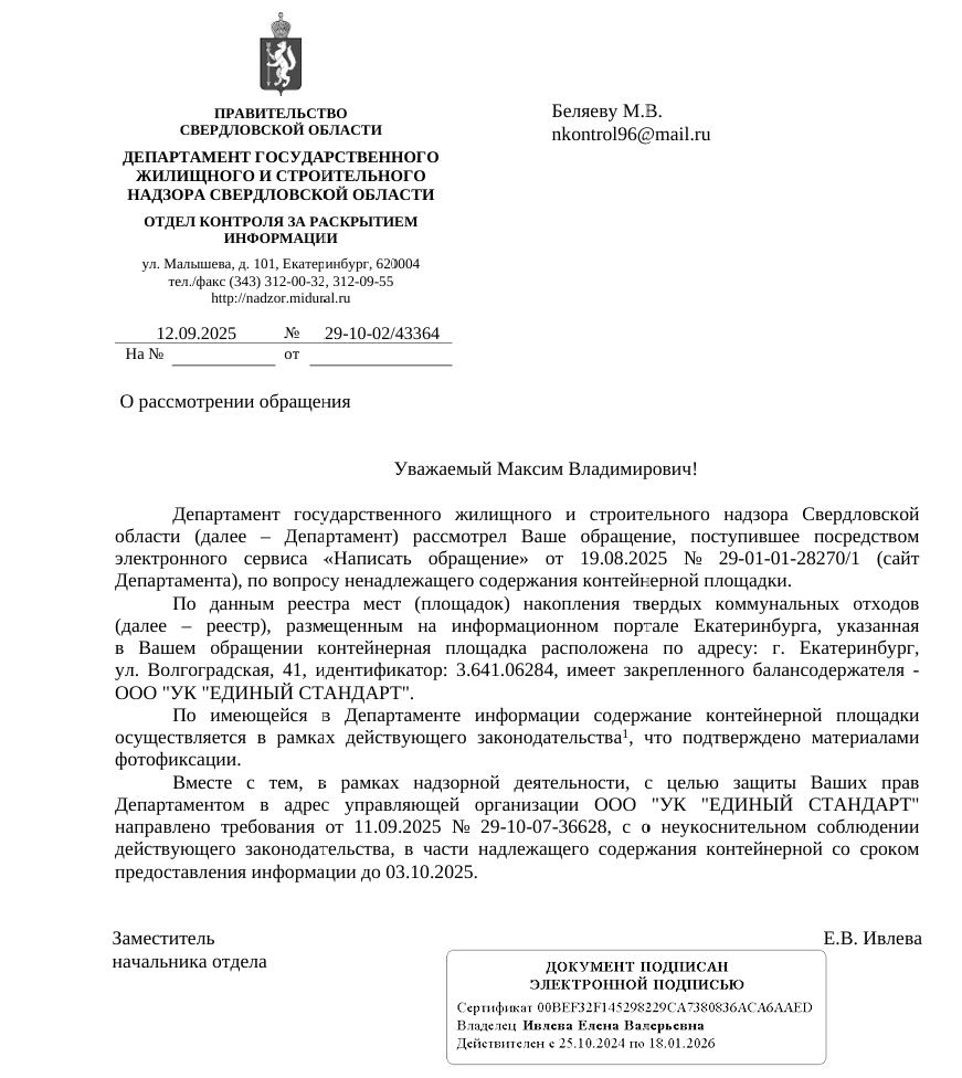 В ответе Департамента государственного жилищного и строительного надзора Свердловской области сообщается, что контейнерная площадка по адресу ул. Волгоградская, 41 официально зарегистрирована в реестре и закреплена за управляющей организацией ООО «УК «ЕДИНЫЙ СТАНДАРТ».