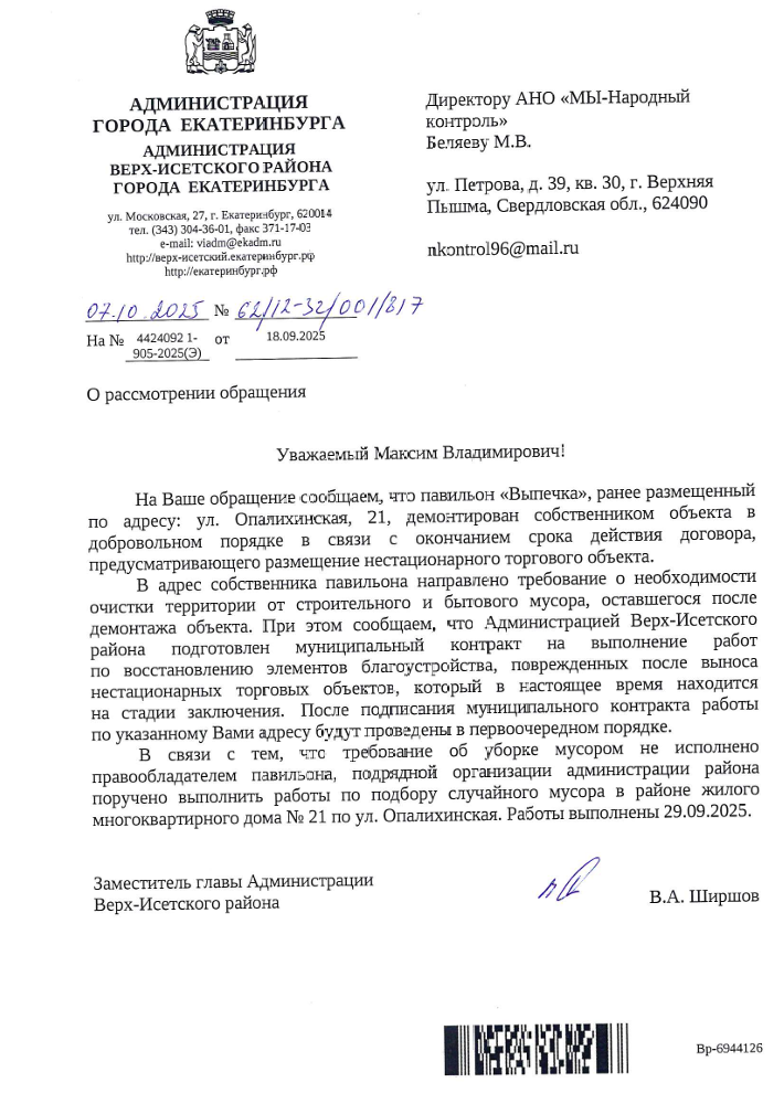 В ответе администрации Верх-Исетского района указано, что павильон «Выпечка» был демонтирован собственником в добровольном порядке.