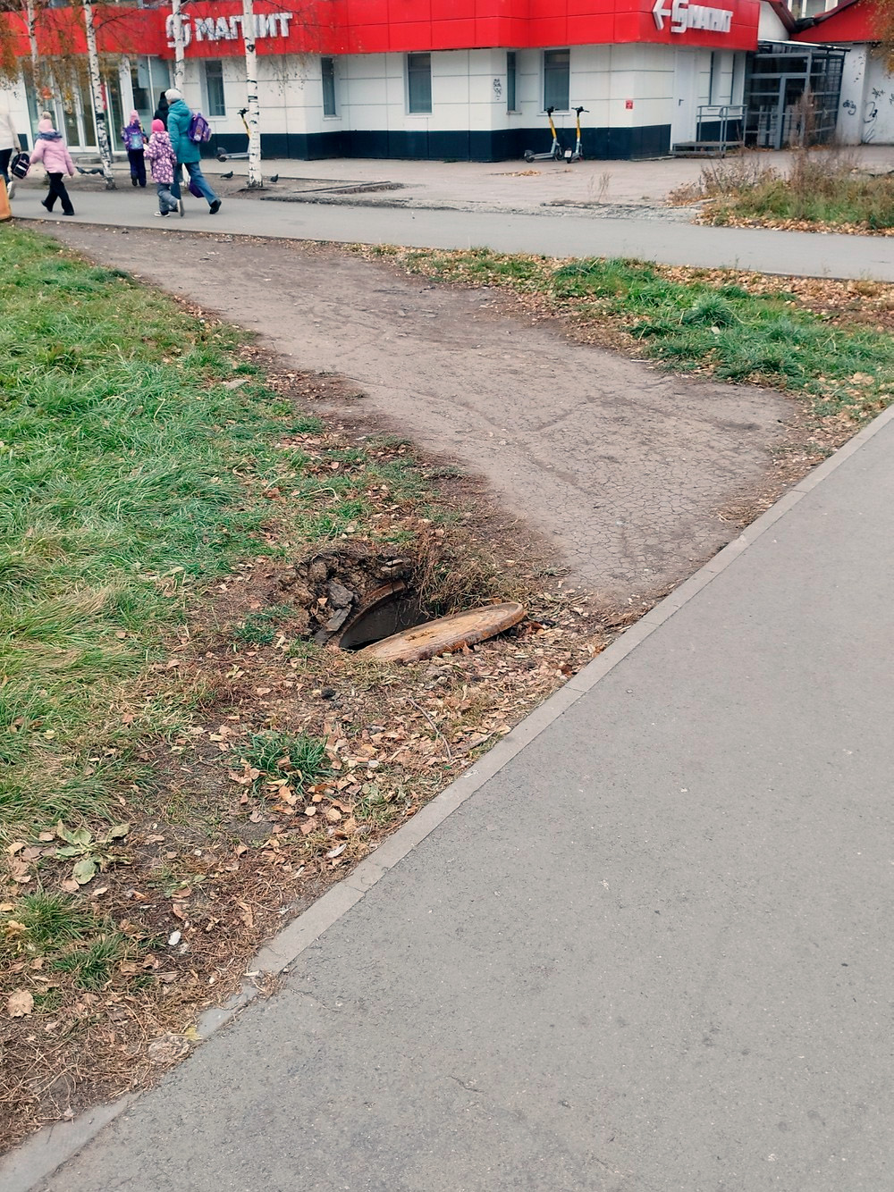 Екатеринбург, Эльмаш. Перекресток Фрезеровщиков — Таганская в сторону магазина «Магнит» (Фрезеровщиков, 47). Сломан канализационный люк. Толпы детей-школьников каждый день переходят этот перекресток в 167 школу. Прошу принять меры.